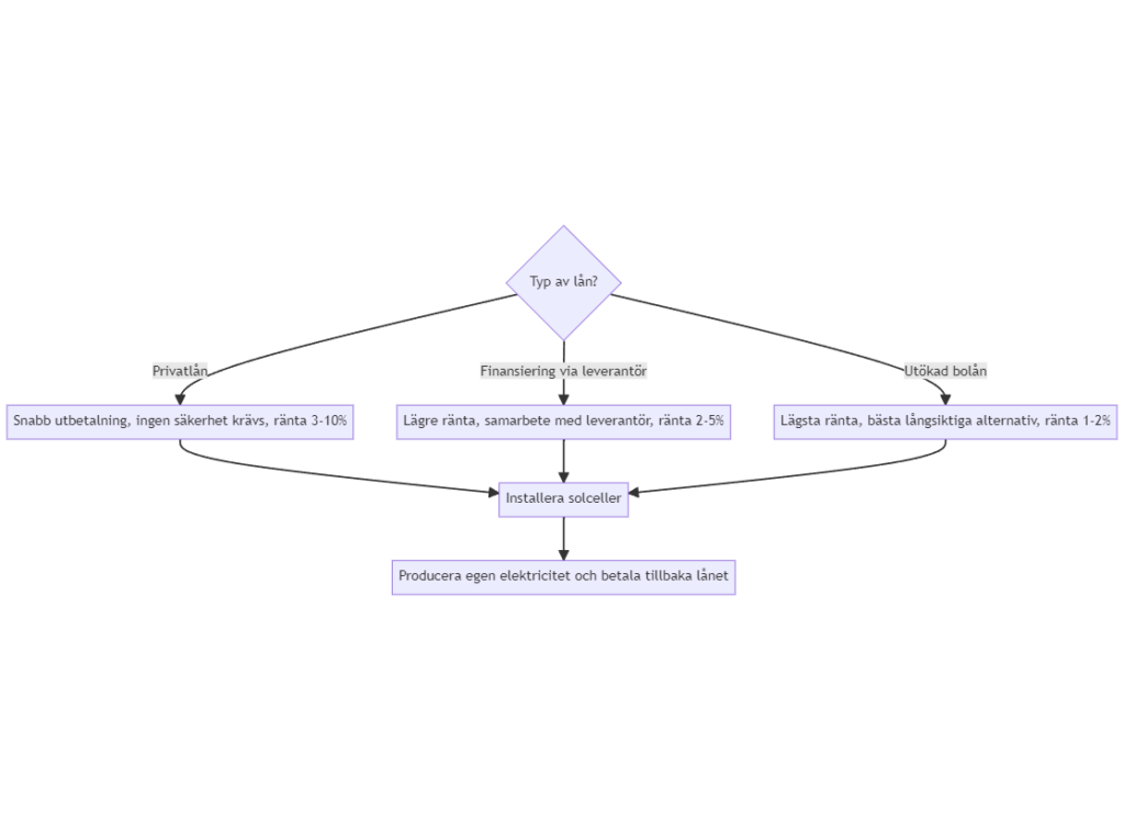 Om du har möjlighet, kan du också välja att utöka ditt bostadslån för att finansiera ditt köp av solceller. Detta är oftast det mest fördelaktiga alternativet, eftersom räntan på bostadslån generellt är mycket lägre än för lån utan säkerhet.